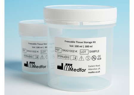 Medfor Freezable Tissue Storage Kit er en steril, dobbelbeholder for sikker oppbevaring og fryselagring av menneskelig vev for transplantasjon og biobankbruk. Settet er spesielt utviklet for bruk i vevshåndtering der prøver må lagres ved lave temperaturer over lengre tid.